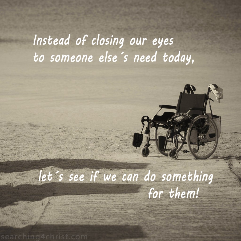 It happens every day. Someone outside a store asks us for some change or a raggedy vagrant holds out their palms towards us for some help. Our reaction immediately questions why they prefer to beg instead of finding a job. We don´t want to encourage their obvious lack of concern for their own welfare. So we pass by trying to forget the money we have stashed away. Or perhaps a co-worker who is often grumpy or rude may be in a bit of a bind. We may notice but secretly hope they learn to be nicer so that someone will want to be nice to them. Whatever the case, we don´t know what God is working on in their lives or may not see that there is a lesson from Him to us in these uncomfortable moments. What we do know is that God sees them and is more concerned with where our hearts are in these moments than in our finer moments of generosity. So, just in case God placed the awareness of the other person´s need before us, let´s do something kind today. And let´s pray that our eyes are opened to see even more opportunities to be like Christ and help those around us!