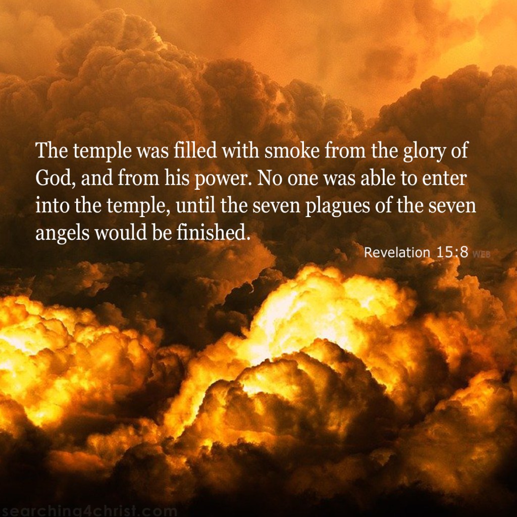 The temple was filled with smoke from the glory of God, and from his power. No one was able to enter into the temple, until the seven plagues of the seven angels would be finished. Revelation 15:8 WEB