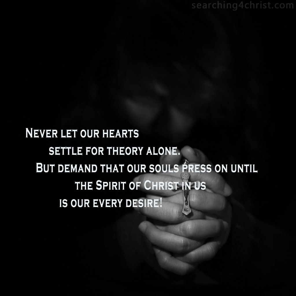 Far too many people these days will not stand to speak of God, His Son, or the plan of our redemption. The sad part is, that even the ones who will let the conversation turn to God and pay Him some respect, will do so only on the level of theory. People hold their hearts far out of reach of the Lord as if still hiding in the Garden of Eden. We tend to feel more comfortable discussing doctrines and interpretations. All the while, we guard our hearts and do not let them ache for Him. We sense our need to be filled with the Spirit. But, we are too tied to our earthly lives to let go and feel for Him as the stricken believers did of old. Oh, if only we could hunger after the Lord! Oh, if only we would let ourselves thirst for Him and go after Him as if we needed Him near us now! Oh, if only we would leave the lesser forms of study and worship and press on with a desperate need, that can only be filled by His presence! Oh, if only we would let our hearts seek to be so close to the Lord that His Spirit will finally fill us! Let´s pray that whatever theory we have today will drive us to seek Him until our lives radiate with the presence of the Lord!