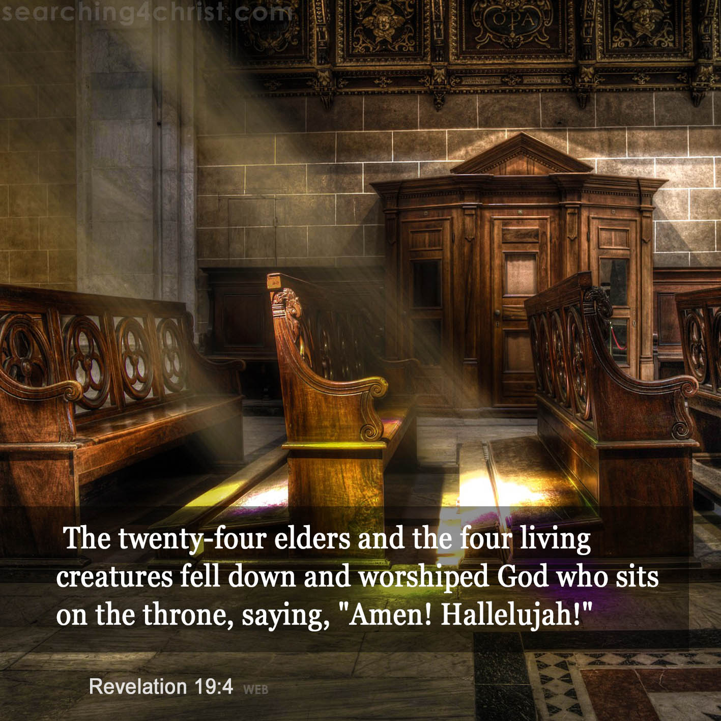 The twenty-four elders and the four living creatures fell down and worshiped God who sits on the throne, saying, “Amen! Hallelujah!” Revelation 19:4 WEB