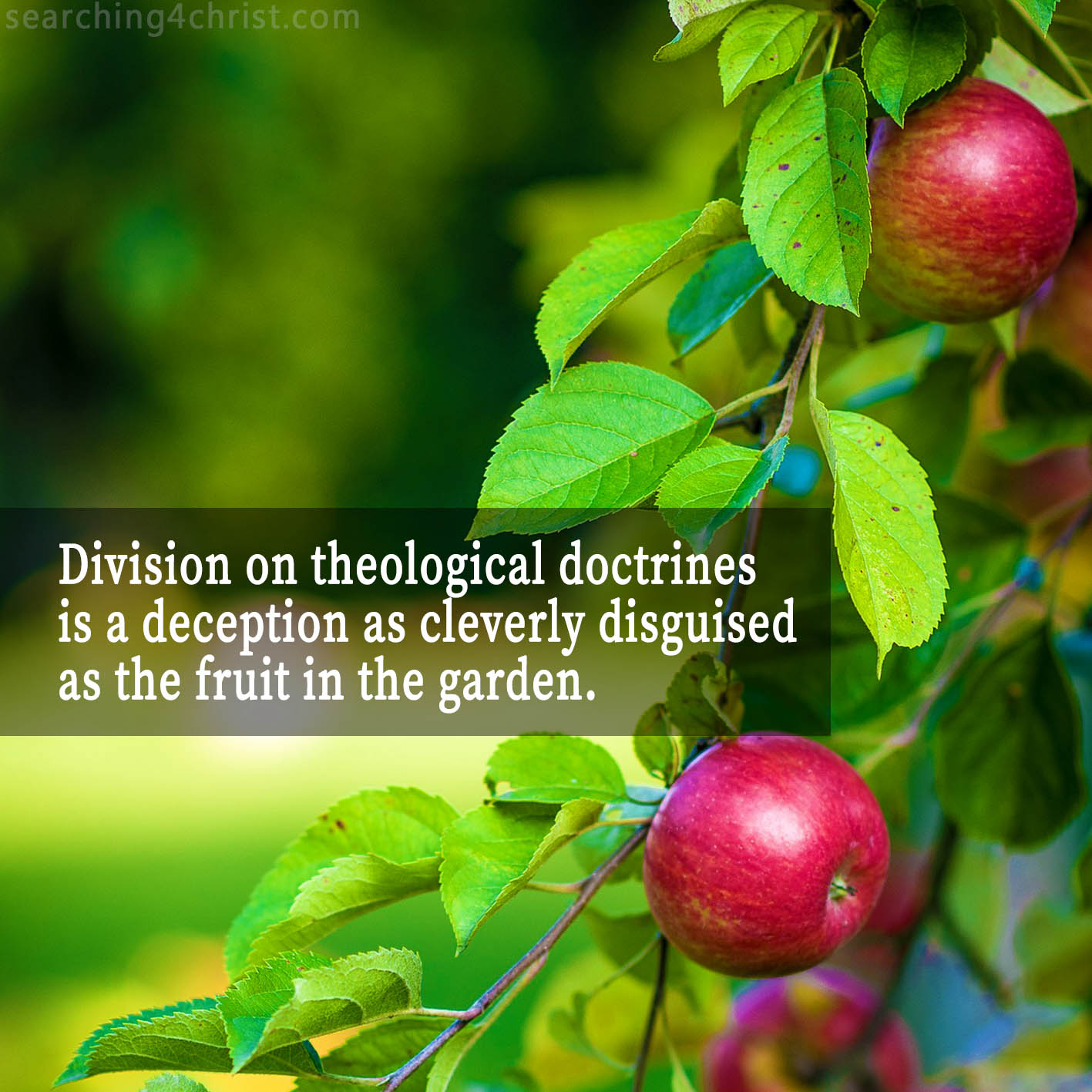 The Bible describes our earliest beginnings as people being tricked into letting our eyes and our hearts turn away from God. It might seem right to some to blame one fruit or one man for our treason. But, there are many different fruits in the garden of life and too many have the potential of drawing us further from the Lord. We need to recognize that our religions are subject to the enemy’s attack and if dark qualities of argument and strife can enter our hearts. When they do, then we have fallen prey. Being aware of darkness´s interest in spoiling our faith, we can be vigilant and diligent in making sure that sourness does not enter in. Strife and quarreling amongst the churches, pointing fingers, and comparing should never enter our hearts. Pray that we all keep our eyes and our hearts on the Lord Jesus Christ! Let´s walk as closely with Him wherever He leads us in love!