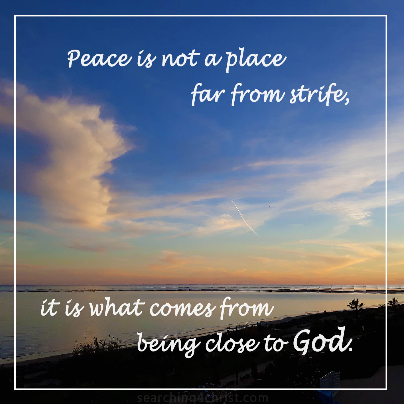 In our crazy rat-race these days, we find ourselves dreaming of a place where we will find peace. Many people look forward to a holiday that they are planning or a day off. But often, those times can be just as stressful and busy. Other people can get the notion that once they reach a certain financial peak or a status at work or school, then they will be at peace. However we see it, what we call peace may never come or is too short-lived to improve our condition much. There is a peace though, like no other! There is a peace that comes to some of us. There is a blissful rest that comes to ones who realize what is truly needed to get it. The precious soul who discovers the joy of walking with the Lord reaches this lofty peak. Every sunrise and every sunset and a million moments in between provide them with their moments of peace. It is a sweet and enjoyable thing to drop our worry and stress and just revel in the nearness of the Lord. We too can have this peace. But we will have to stop our scurrying about and learn to just be with Him. Shall we now?
