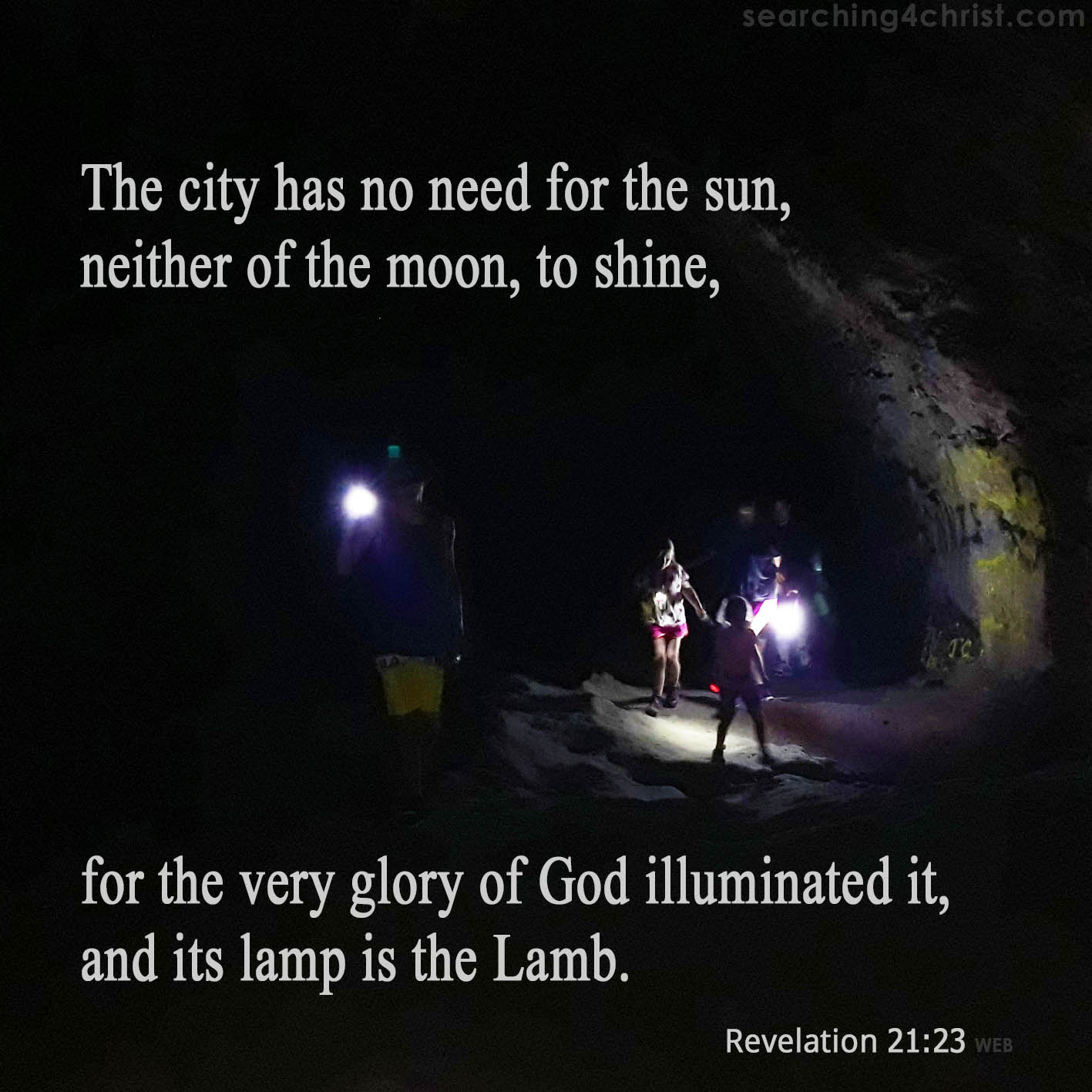 The city has no need for the sun, neither of the moon, to shine, for the very glory of God illuminated it, and its lamp is the Lamb. Revelation 21:23 WEB
