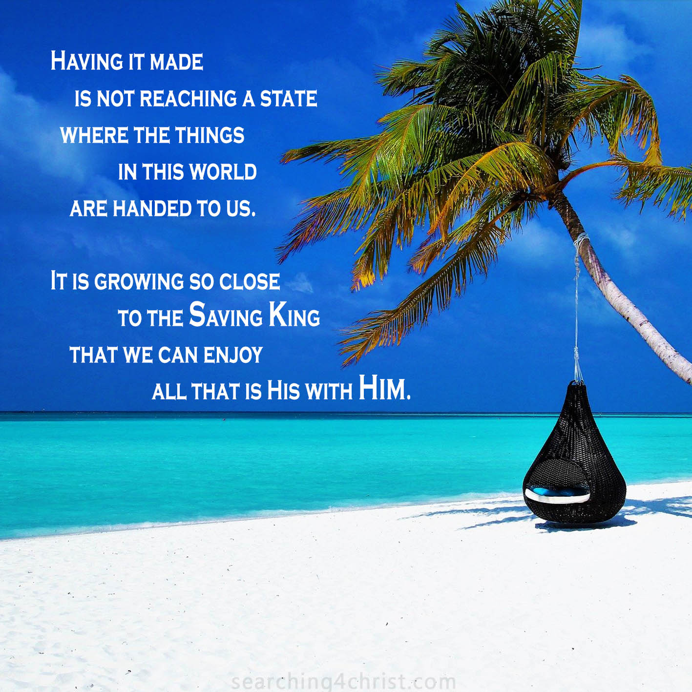 Even good Christians can get so wrapped up in this world where we live that we measure our success on what we can gain here. However, Christians are different from the rest of the inhabitants of the world. In choosing to believe in God, we choose to believe that there is much more going on in Heavenly Realms than we can see with our earthly eyes. In God´s Kingdom, there are higher goals, there are higher morals, there is purer love and there is a completely separate system of value. Here we greedily seek money, fame, power, and ease. In God´s country, what is closer to Him ranks higher in value. All other gifts are dished out according to where they stand in nearness to the Giver. This is why the Father gave us His Son. Those whose hearts go out to Jesus find themselves closer to God´s great heart. The more time we spend with Christ, and the more of His Spirit that lives in us, the more valuable gifts God can shower us with. If we love supremely the One God loves supremely, then Heaven is growing inside of us. If we walk each moment of every day with the Son of God, then we are walking inside the will of the Father and headed closer to Him all the time! We don´t need earthly treasures to tell us that we have been blessed. We need a walk so intimate and so intense that the presence of God brings all the treasures we need.