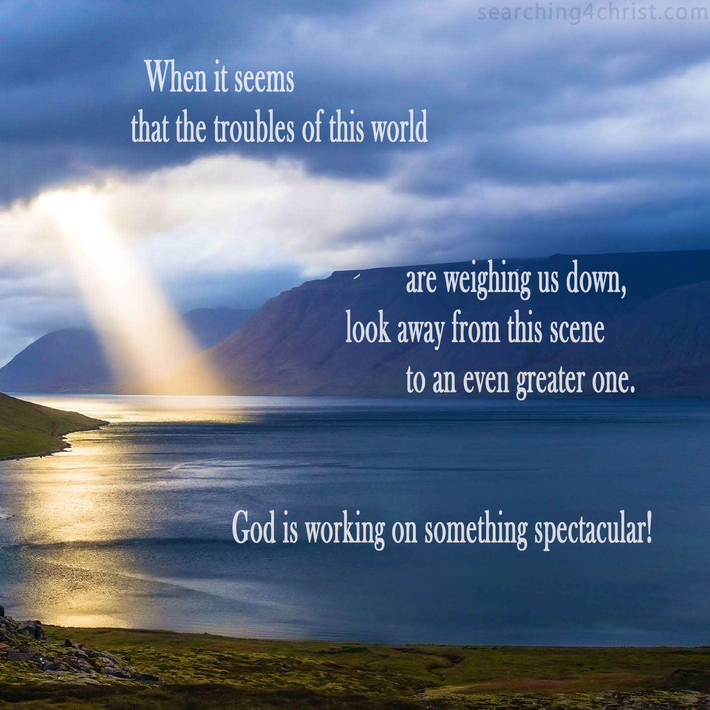 When we start to feel the pain, stress, and troubles of this world bringing us down, all we have to do is turn to God. There is hope in Him because He is far bigger than our problems and our strife. All the strife in this world will be wiped away in an instant when He says that all has been fulfilled that needed to be done. In the blink of an eye, all crying and pain will disappear. The Almighty orchestrated His plan to save mankind and restore us to intimate fellowship with Him as we were initially brought into existence for. Sure, our world chose to rebel against Him and go along with the Father of All Troubles and Lies. But, even the part that we played in that treason has been carefully and lovingly dealt with. What remains to be seen in God´s great plan of redemption will be the most breathtaking of all! We shall see the return of our Savior, the King of Kings! We will be brought into the presence of God and see Him face to face! We will have every tear dried and have no more cause to suffer! There, we will be with God, and He will be with us! A time has been given for the troubles of our world. But, when we experience the joys that we will soon see, none of these problems will ever be able to bring us down again! Look up to the Lord! His salvation is with Him, our hope, our joy forever! Amen!