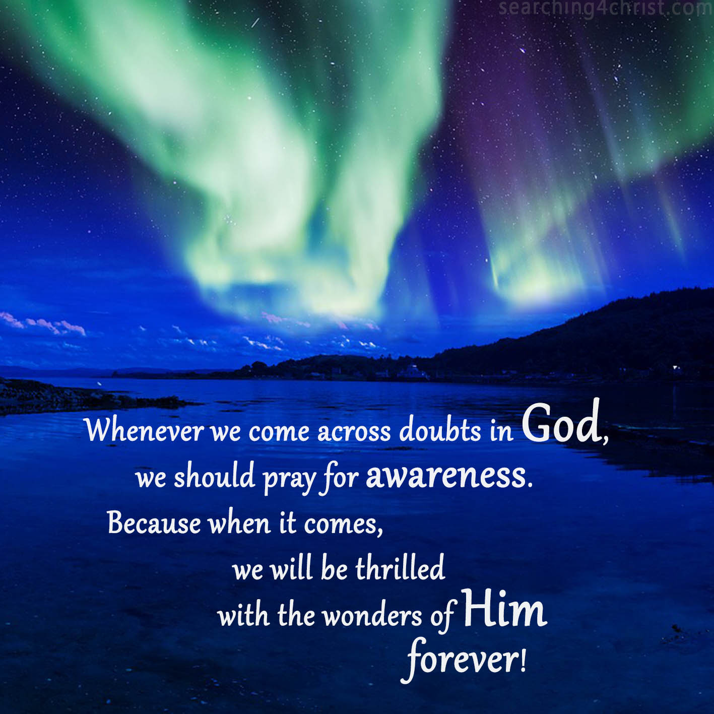 Today we find many people struggling to believe in. We also have more people all the time who have decided to not even try. This is unfortunate for those who do believe in Christ and are expecting Him to return because we do not want anyone to miss out on being with Him forever. The reasons for disbelief are many and quite possibly some fall away simply because they get the impression that believers look down on them for their hesitance. But as long as we focus on our earthly scene we will never be placing enough emphasis in Glory where our Lord is at work to save all our souls. We all need to shift our attention from us to Him. We all have to humble ourselves and seek our Savior. When someone can break free from the distractions of this world and does set our heart on God above, then He is pleased to move into the sphere of our awareness. It is a thrilling and frightening experience, but, it is the only thing we need. Once a soul has been touched, thrilled, and bewildered by the overwhelming presence of God, all frivolous thoughts and doubts will vanish. All we will want is to see more! Press on dear searching children for the wonder and joy that is set before us!
