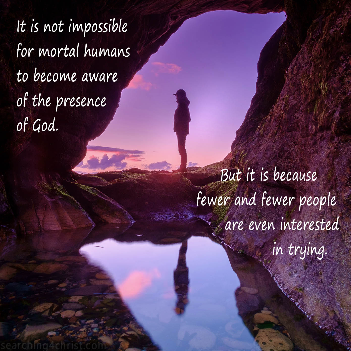 We humans have plenty of history and tons of testimonies from mere souls like us who have somehow woken up to find that God is near and waiting for us to come into contact with Him. The problem is that there is a very powerful and fierce force that does not want us to ever really come to know Him personally. One does not need to be an expert to see this hateful resistance to embracing God. All we need to do is bow down on bended knees and turn our hearts towards the Lord in humble submission. Ask that He will make His presence unmistakably known to us. If our desire to be with God is genuine, we will step out of the world´s parade and the opposition will come. However, if knowing God is what we would set ourselves to, we could have a walk with Him full of heart-thrilling discoveries. We will never have to be alone again because the mightiest Power of all the universe will be walking with us through our day! We will have to learn to meet Him on His terms in reverence and submission. But it is completely possible. So, if we are not walking personally with God today, let the encouragement sink in for us to try. We will forever be surprised and bewildered by His wonder and love!
