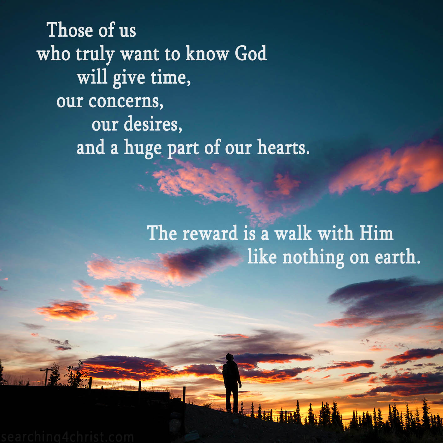 Some religions talk heavily about there being a God but never really try to bring their listeners into much contact with Him. The fact that fewer people all the time even want to consider religion is probably a reaction to this failure. The whole reason why anyone should ever worry about whether God is here or not is so that some of us will actually try to draw near to Him. If we sit back and listen to conversations about God, we will almost always hear the word “I,” quite a bit. Unfortunately, whenever “I,” or “we,” is our main concern, very little progress is ever made towards approaching our Unseen God. A sacrifice is still needed. It is not the sacrifices of old that work. God´s Son came and gave His life, now we should follow and give of ourselves. Few will care to try to make the effort. But those who will sacrifice of their selves will draw near to God. He is waiting and looking for humble souls that are yearning to be filled. We can be those precious ones who will encounter the Lord today. The prize is set before us. Let us come with open hearts and ask for strength to give whatever we need to today. God will reward those of us who truly want to walk with Him by moving into our lives, our hearts, and our conscious awareness. It is an experience that is well worth the sacrifice.