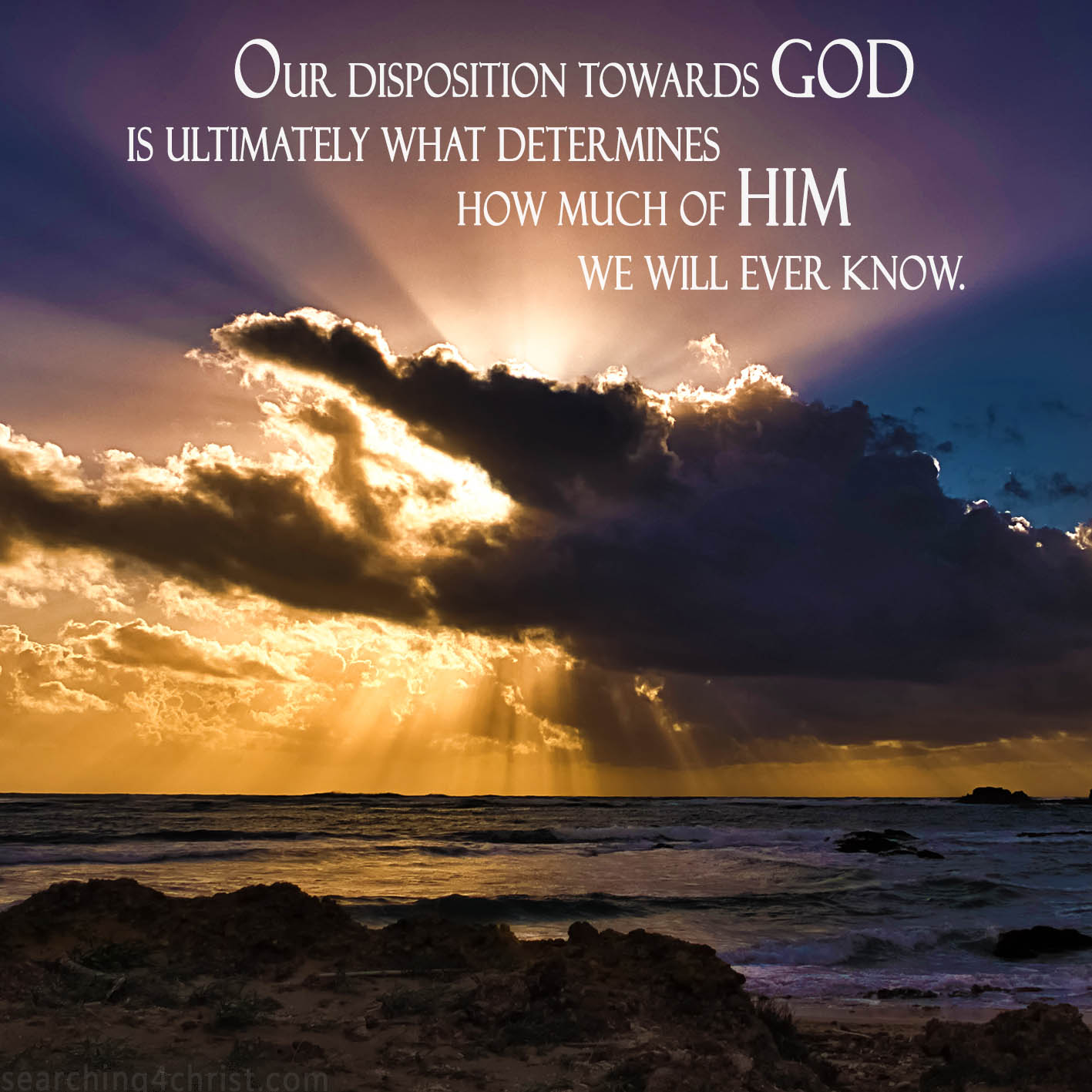 Wikipedia defines the word disposition as a quality of character, a habit, a preparation, a state of readiness, or a tendency to act in a specified way. We can easily see from that description that depending on what our disposition toward God is will decide how well we will ever know Him. If we think little of Him, we will have little, know little, and experience less accordingly. If, however, we are able to open our heart towards Him, if we kindle this desire to know Him and be near Him, then there does not need to be any limits to what we will experience. God is good. He is infinitely better than we have imagined. Those who have been allowed into His presence know and are thrilled and bewildered. We too stand a chance of having our understandings quickened and the doors of our reality blown right off if we can find a disposition to the Lord that lets Him show Himself to us. People like to be cautious when dealing with their sensitive hearts. We struggle to let go and step where we cannot see. However, some will turn to Christ with a heart that aches to be shown the wonders of God and will go on to cultivate that thirst. If we do, we will be thrilled and amazed by what comes next!
