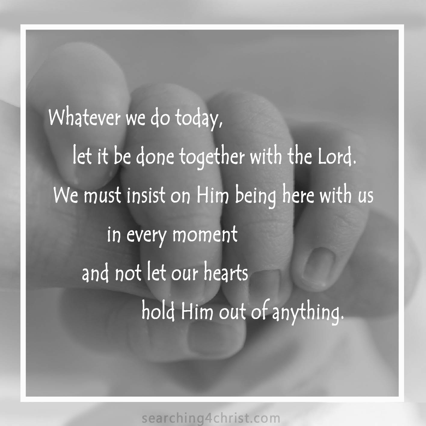 Most of us will go through our day never realizing that God is present and longs to walk through every detail together with us. Some will have their devotions and then get up and go out to hurl themselves into their busy routines. All the while, the Lord is near. He has never left our side nor wants to be excluded from our hearts or our thoughts. It would be a different world if we truly walked through each step of the day along with Him. If we practiced including our Savior in each decision, in every word, and in our thoughts, His presence could remain with us. We do not need to stay there on our knees talking to Him if we continue our conversation with Him as we go about our busy routines. Our whole lives will be full of the love of God, His wisdom, and the power of the Holy Spirit as soon as we learn to remain with Him every step of our day. Let us set a new goal now and make bringing our Lord into each present moment our most pressing desire.