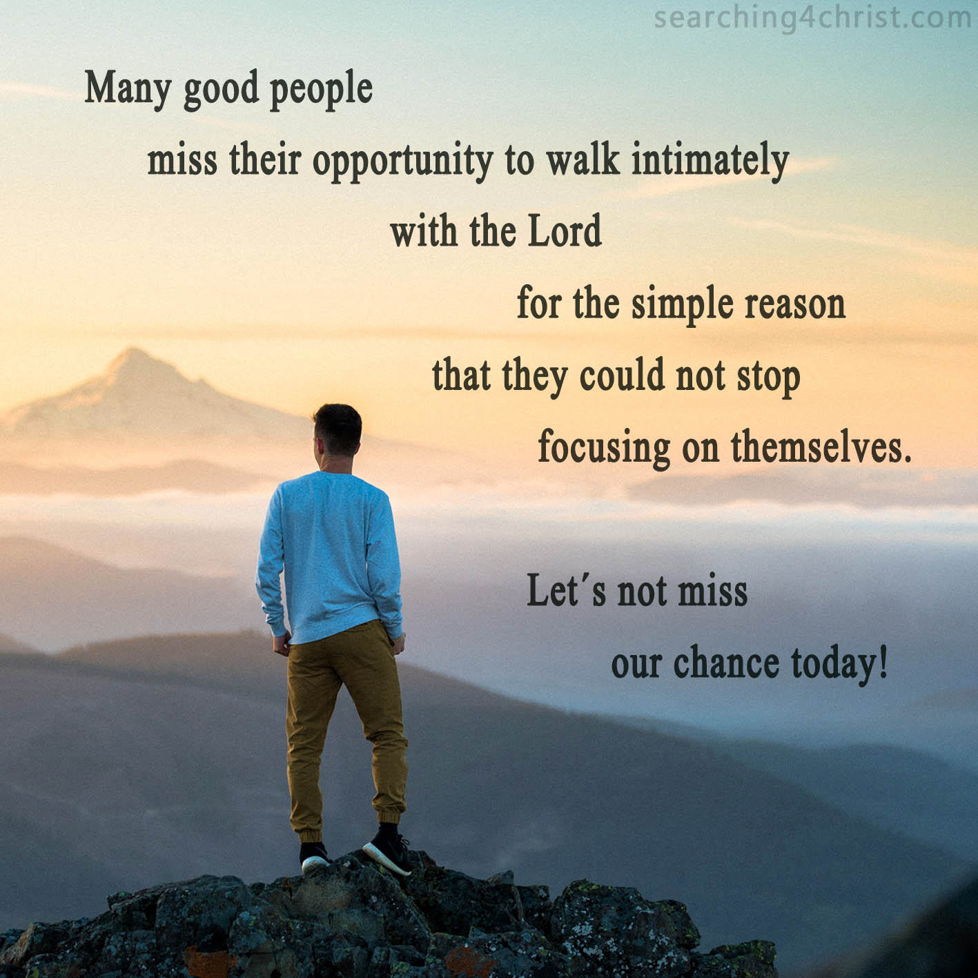 One would think that it is not harmful to focus on our dreams, our desires, or the things our hearts go out to. But whenever we are the focal point, we are keeping God from His rightful place in our hearts. It is impossible to focus on the Lord while we are focusing on ourselves. When looking to please ourselves we shift our attention from Christ to us. If we could keep the focus on our Savior, if we could live to please Him no matter what it cost us, we would have the relationship with Him that He has been wanting from us. Let us pray that we resist our heart´s tendency towards self, make God the central focus, and walk intimately with Him today.