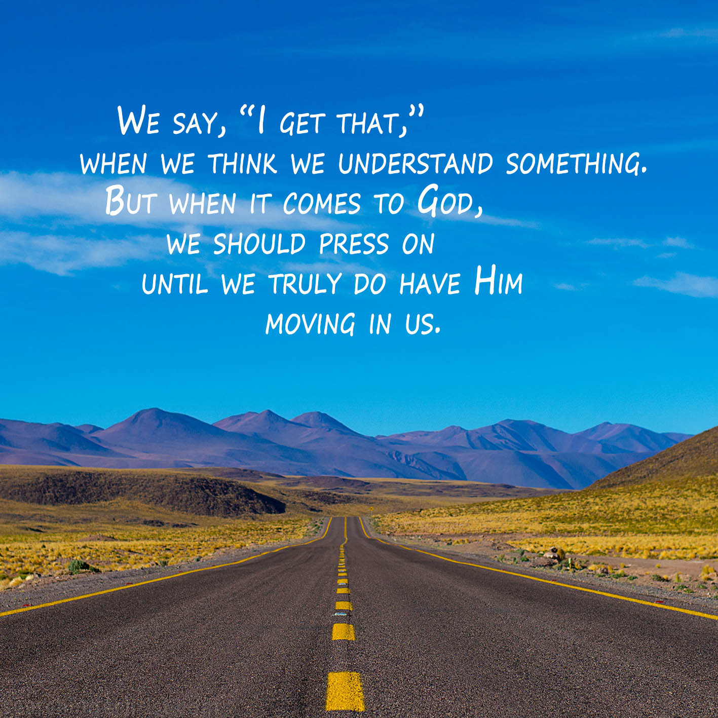 It is a common thing to say these days that we get it. People throw it out whenever they feel like they understand a point or catch the direction whoever they are talking to is trying to go. It happens to be a very useful expression and comes in handy. We might even be surprised to see how much people use it. However, like all things that come out of our mouths, it is good to search into how it relates to our relationship with our Heavenly Father. If we bring each thought and every tendency of our heart to Him, God will be happy to give us insight and instruction that will eternally benefit our walk with Him. If we bring a statement like “I get it,” to the Lord, He is already helping us “get Him!” Getting more of God´s Spirit in us draws us closer to our Savior and to all that is good for us. Let us strive to “get Christ,” so that He will be with us always!