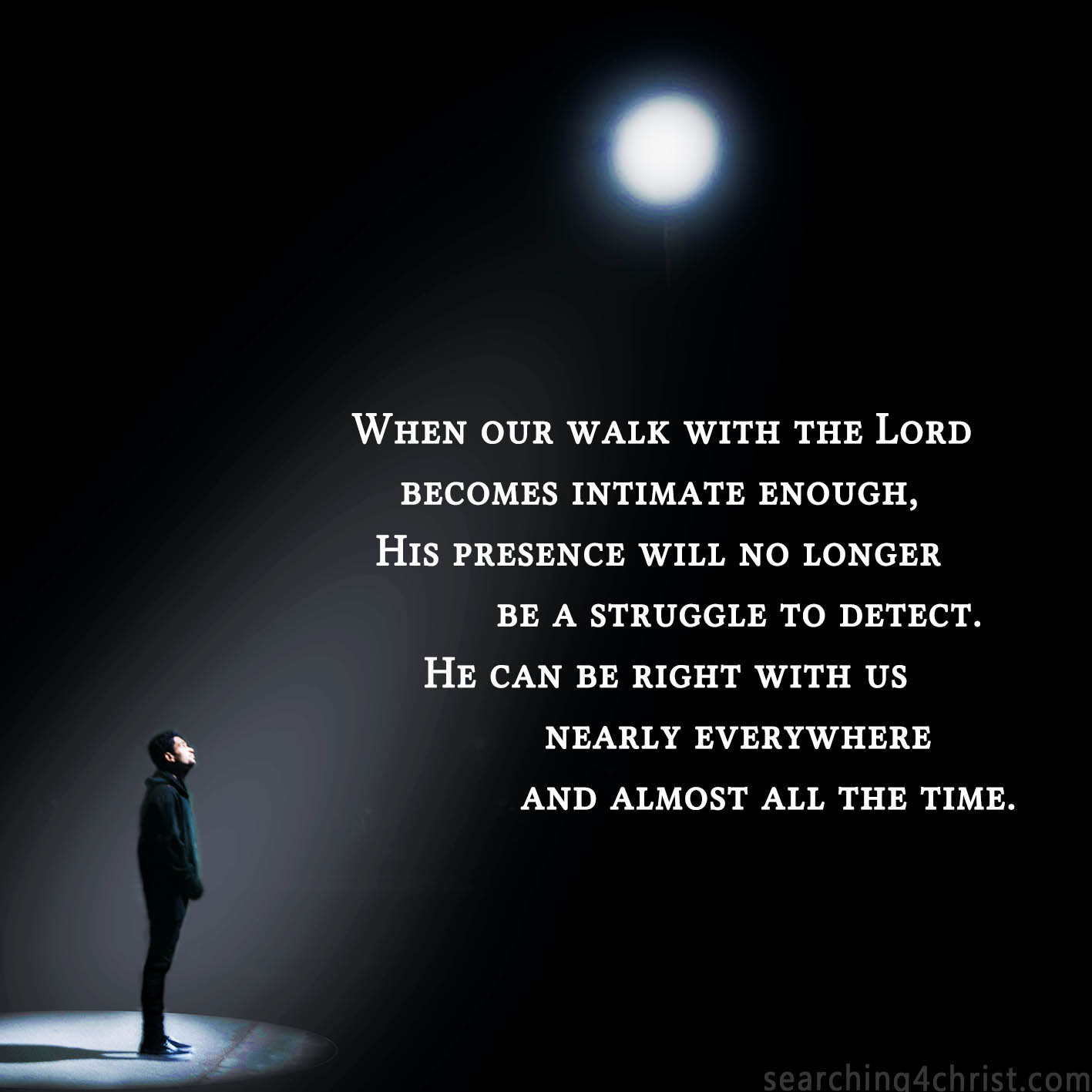 We would think that it should go without saying that each of us should be enjoying precious moments within the conscious presence of the Lord. However, that is often not the case. Many Christians know all the doctrines and strive to live as we are taught that believers should. All the while they could go years or even a lifetime without a striking encounter with Him. They may hear stories or know people who have become aware of the presence or movement of God and sense a bit of jealousy and wish that it could be them who experienced God. What we need today is more brave people who will encourage all God´s children to press forward. We need to recognize our yearning to experience the Lord for ourselves. We each need to have our awareness quickened. We should each be striving daily to walk in hushed silence within the radiance of His presence. The Way is open to us all, step close enough to the Lord and He will open our hearts and our eyes to His immediate presence. Let nothing keep us from Him now!