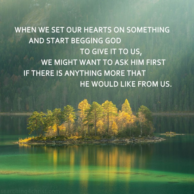 It is easy to fall into the trap of thinking of God as our way of getting the things that we want. The reason for this is that the Bible has told us to bring our desires and prayers to Him. (John 16:23; John 15:7; James 4:2) However, what we forget is that our hearts should go out first to God, period. If God is what we love, if it is truly He whom we love, then He is pleased to bless us. The other side of this coin is that if our hearts go out first to the things we desire, He does not do us any good in giving us what we long for. If what we long for is Him, however, how happy He will be to give us all that we want. If what we want then is more of Him, He will be happier still. The important point of our desires should be to learn to place God far higher than any other thing we could possibly want. It is easy to say that we do this, but there is a world of difference between saying it and seeing it through. So, when we pray today, let it be for the Lord to get as much of our hearts as He wants, and let the blessing flow from there!