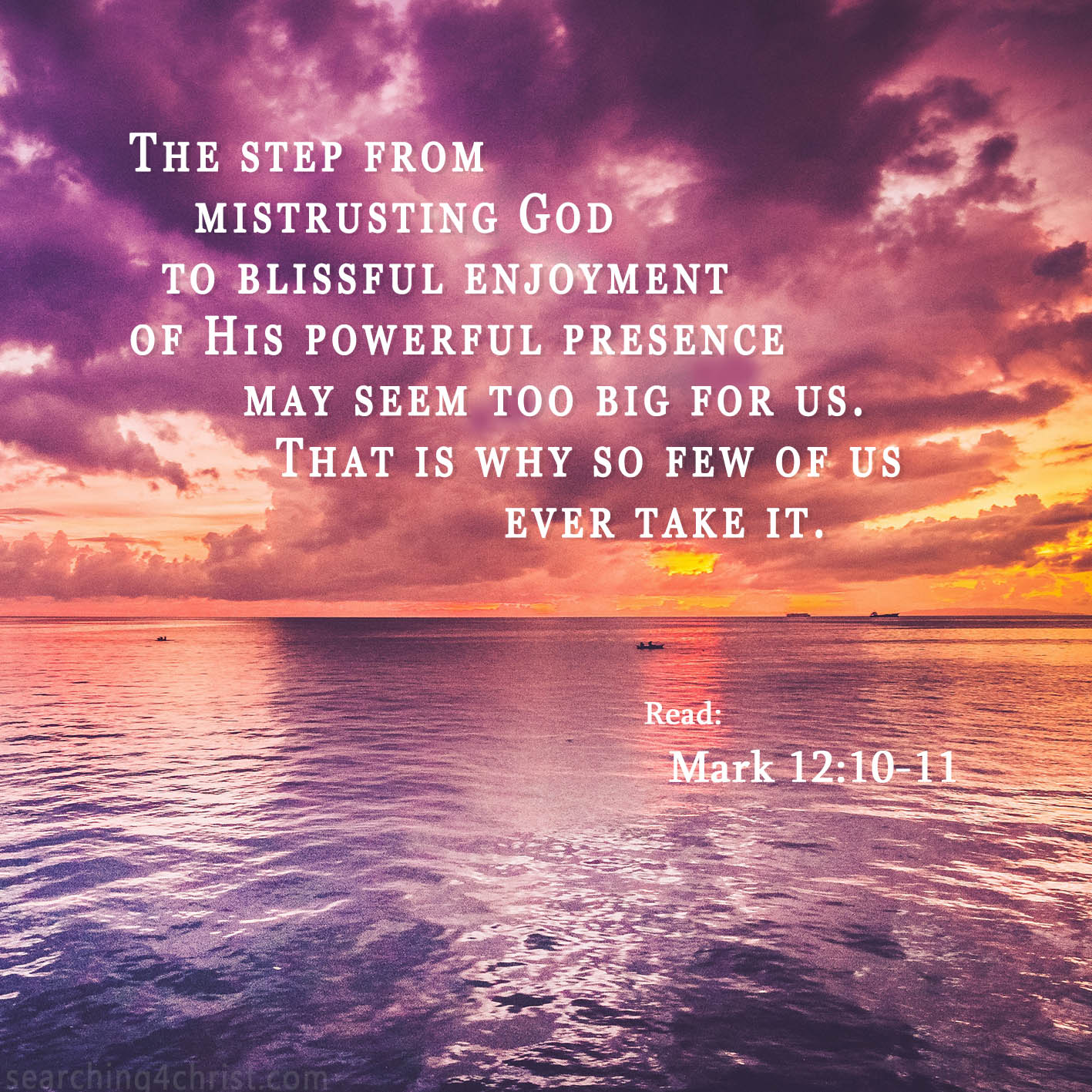 There is a step of faith that far too many are not willing to take. It would set us apart from the rest of the world around us. Even our peers in our religious groups may not be willing to step so far out on a limb. They may not want to be in a situation where only God can back them up. However, trusting God is like that. If we cannot trust Him completely, if we cannot lean on Him when the whole world would tell us otherwise, then our faith is not worthy of Him. If words like this disturb us, we should examine again the caliber of our faith. It is a big step to trust God when everything else in our world is screaming for us not to. However, the precious few who will choose to step out, stand to experience what the angry crowd will not. These peculiar believers will come to know the mysteries and wonders that the rest have chosen to reject.