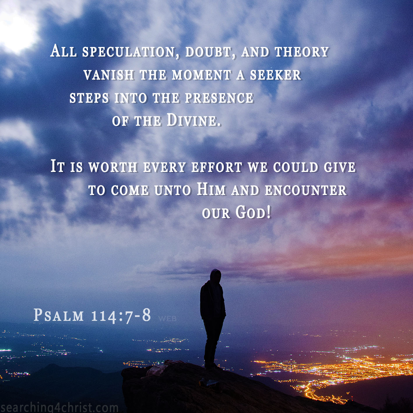It may take a lifetime of searching, but the moment we realize that we have broken through into the presence of God is an experience that will mark us forever. Not only is it worth it for the thrill of that moment, but it more than rewards any effort that it took to get there. In an instant, all theory disappears. It vanishes because now we have met what before we could only hope for. Doubt too, it is nowhere to be found because we have reached intimacy with the Unseen and have experienced His overwhelming presence that is far greater than what we called hard proof before. All theory pales, no, it vanishes when real experience is lived through. Perhaps we will not be able to explain it afterward, but our walk will not be the same. From the moment we have truly bowed to God and been ushered into His presence we will know the One who walks with us.