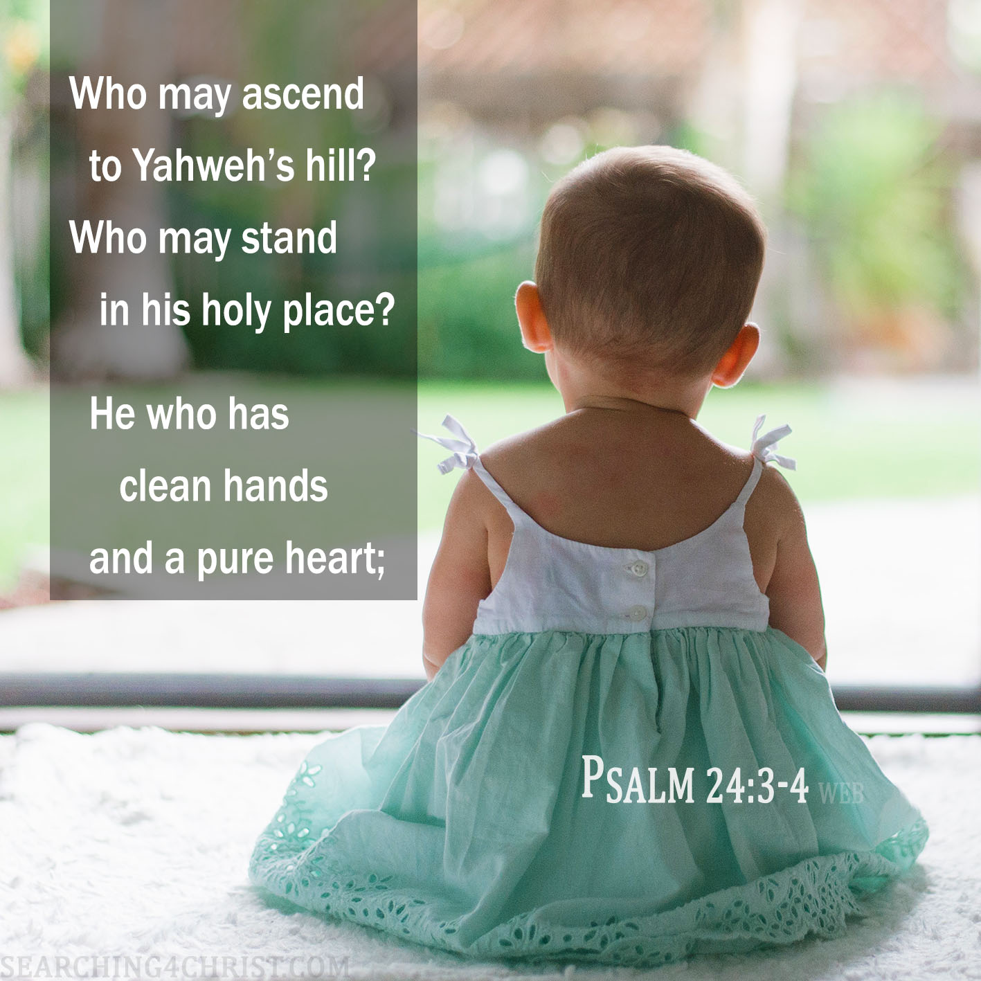 3. Who may ascend to Yahweh’s hill? Who may stand in his holy place? 4. He who has clean hands and a pure heart; who has not lifted up his soul to falsehood, and has not sworn deceitfully. Psalm 24:3-4