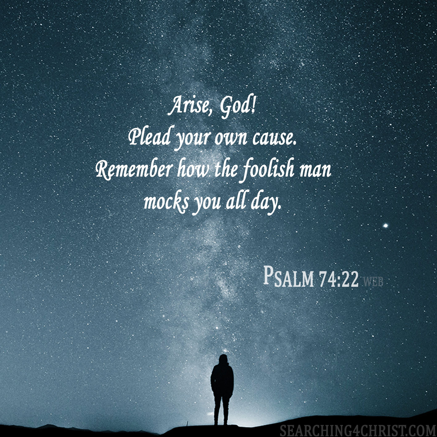 Arise, God! Plead your own cause. Remember how the foolish man mocks you all day. Psalm 74:22 (WEB)