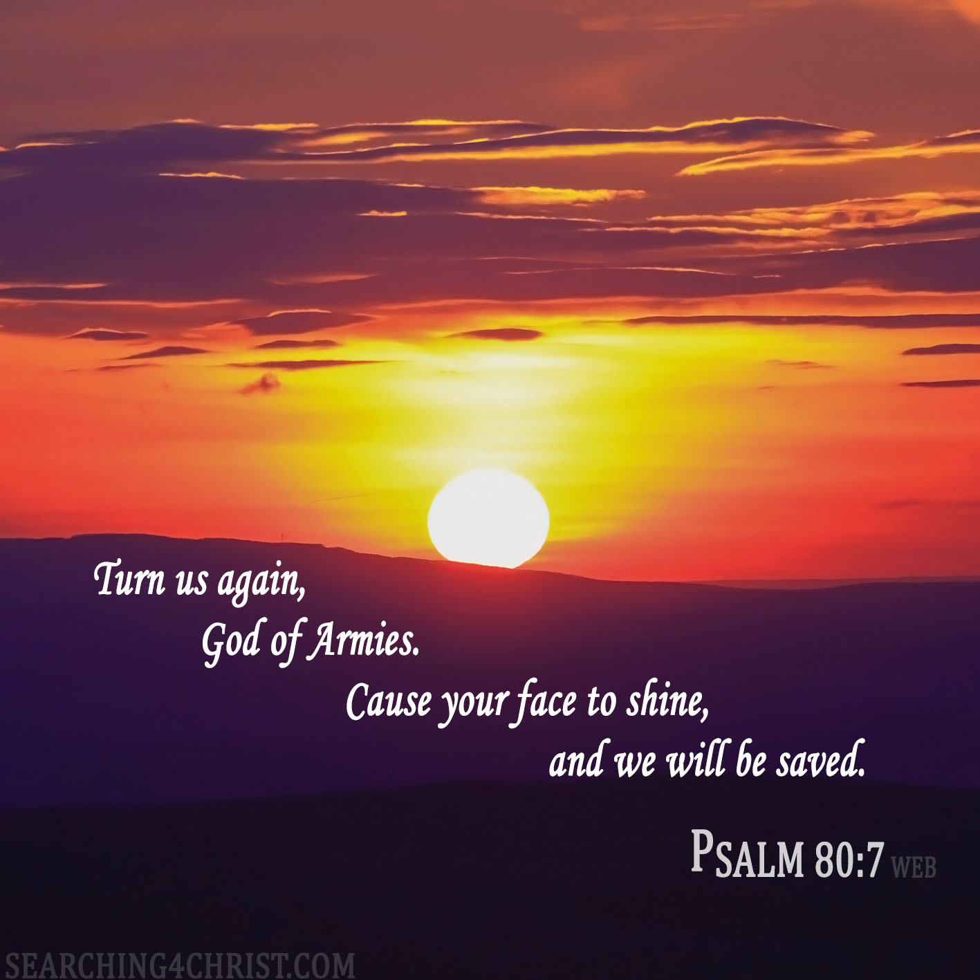 Turn us again, God of Armies. Cause your face to shine, and we will be saved. Psalm 80:7 (WEB)