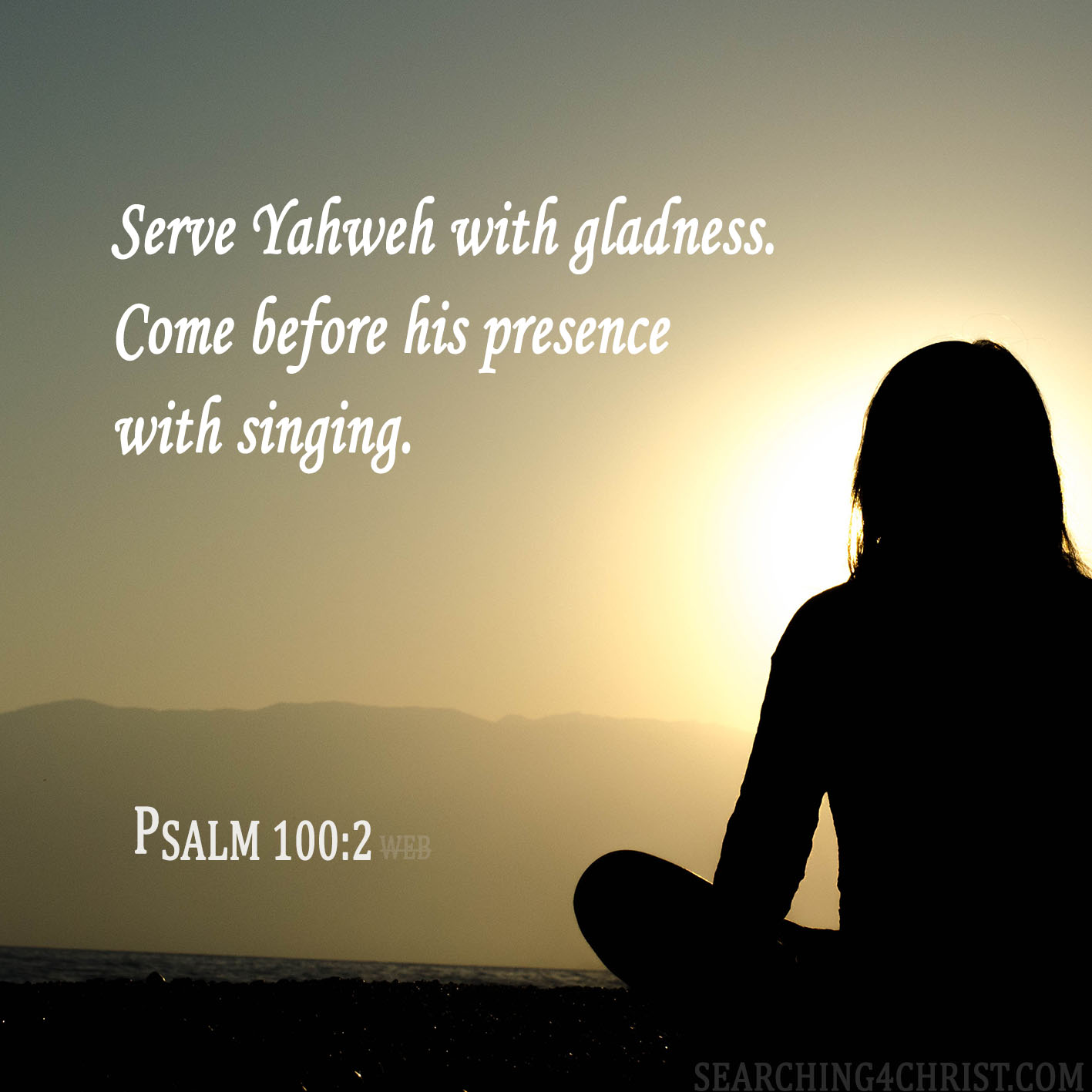 Serve Yahweh with gladness. Come before his presence with singing. Psalm 100:2 (WEB)